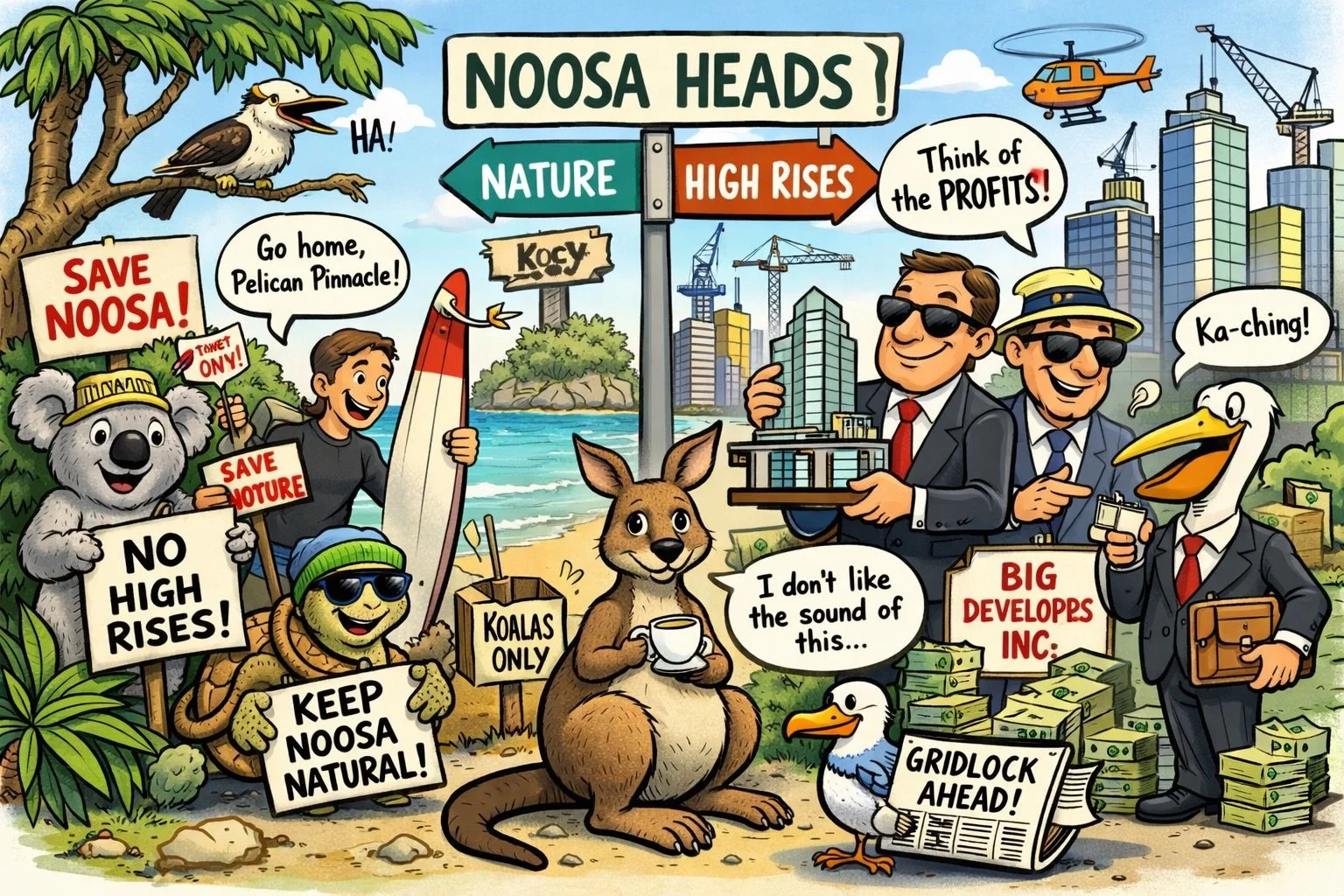 On one side stand the Noosa Biosphere defenders. They fiercely protect the Noosa Plan to ensure no concrete monstrosity ever eclipses the height of a mature paperbark tree.